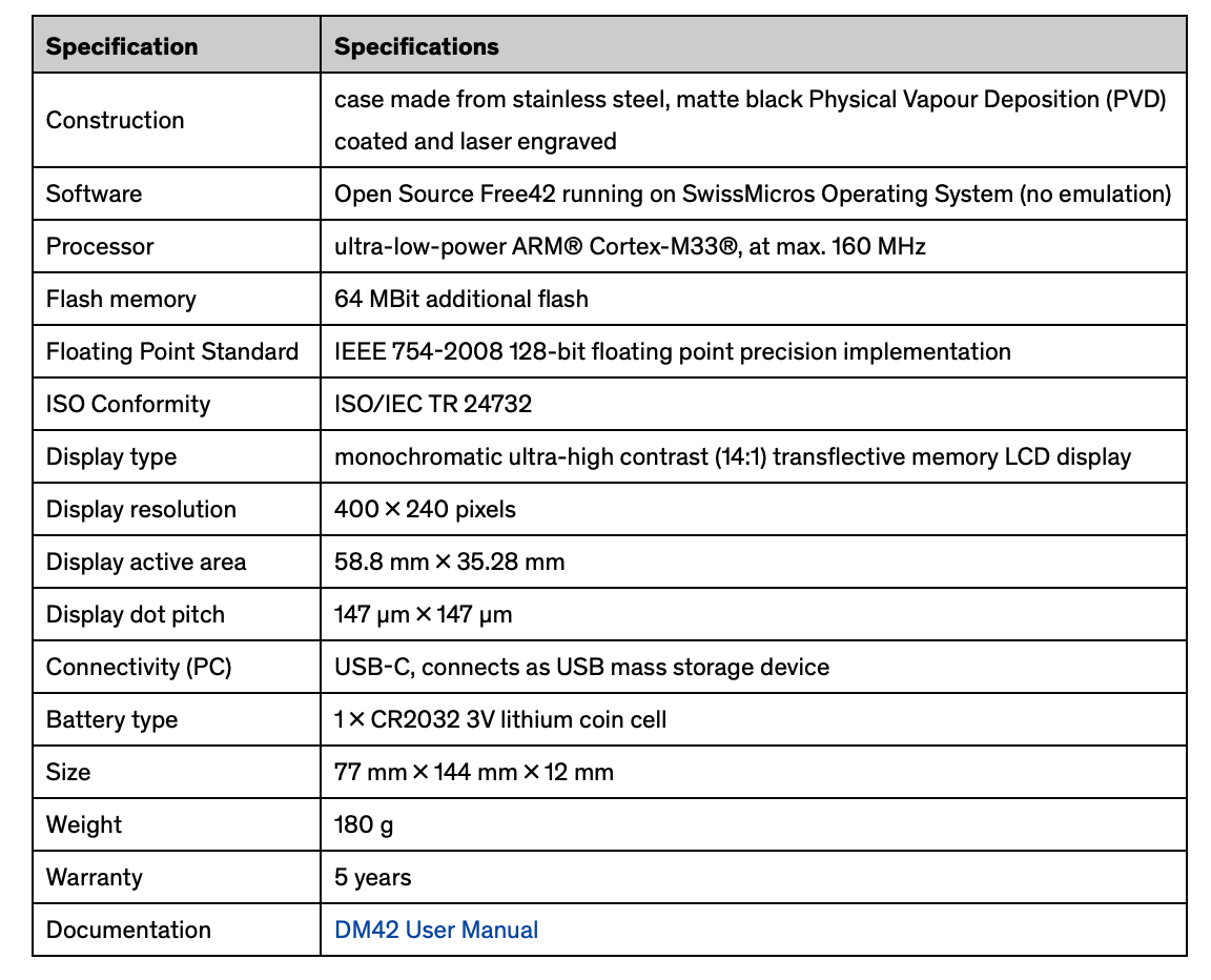 The DM42n is the most precise calculator on the worldwide market — second to none — and uses the powerful and proven RPN logic. The DM42n runs Free42, based on a decimal floating-point math library and IEEE 754-2008 quadruple precision decimal floating-point, encoding numbers in 16 bytes and giving 34 decimal places of precision with exponents ranging from -6143 to +6144.